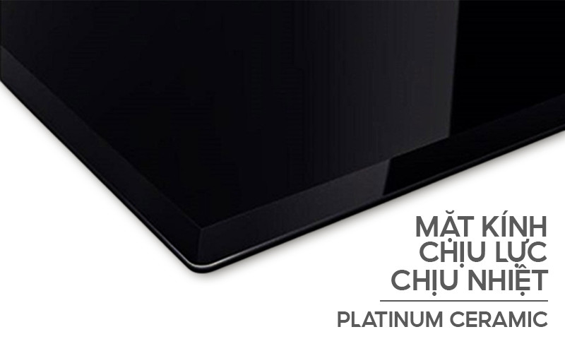 Bếp được trang bị mặt kính ELCD Platinum Ceramic bo viền nhôm 4 cạnh, vát cạnh bảo vệ mặt kính, siêu bền, chịu lực và chịu nhiệt tốt, dễ vệ sinh.