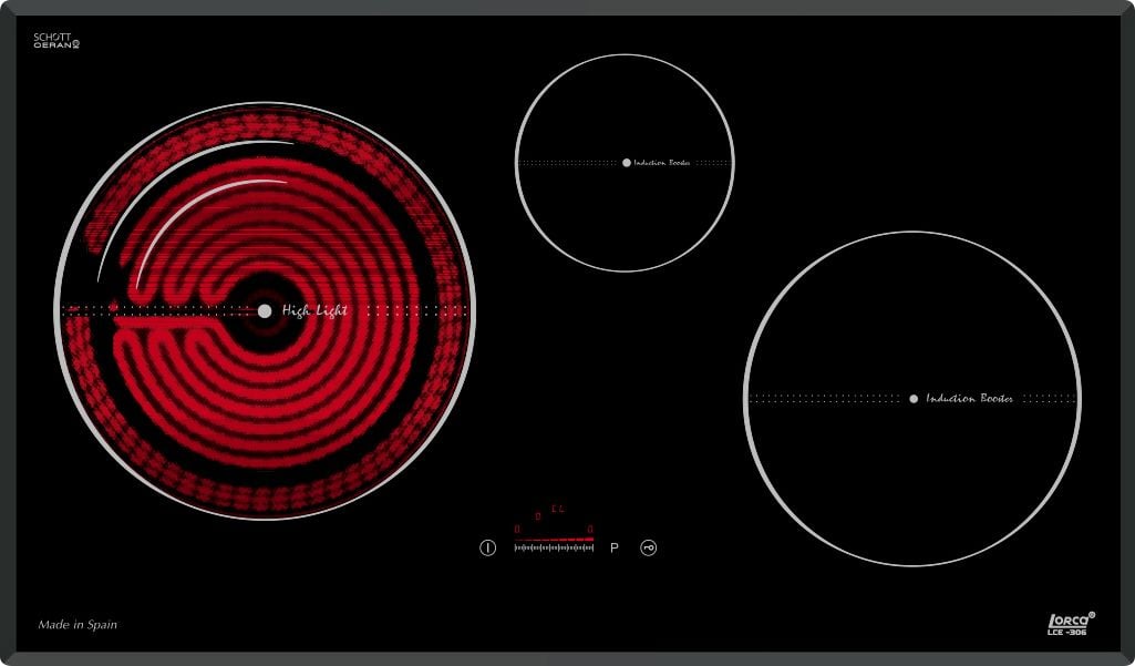 Bếp điện từ Lorca LCE-306 gồm 3 vùng nấu siêu tốc có tổng công suất 6400W với kích thước và công suất khác nhau, giúp bạn sử dụng được những nồi nấu to nhỏ khác nhau tùy vào từng món ăn và nhu cầu sử dụng. Vùng nấu hồng ngoại trang bị mâm nhiệt E.G.O Hi-light 03 vòng nhiệt với đường kính mâm nhiệt lần lượt là Ø270/210/140mm tương ứng với công suất tối đa là 2700/1950/1050W. Vùng nấu từ lớn với đường kính Ø220mm có công suất tối đa là 2300W khi kích hoạt tính năng Booster công suất lên tới 3000W. Vùng nấu từ nhỏ với đường kính Ø180mm có công suất tối đa là 1400W. Chức năng Booster ở vùng từ nấu siêu nhanh, tuy nhiên thời gian tối đa mặc định dùng chức năng này là 10 phút/lần tránh quá tải.