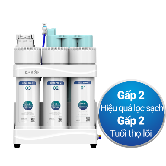 Nâng cấp hệ lõi lọc Smax Pro V độc quyền, tăng gấp 3 lần diện tích tiếp xúc với nước, tăng đến gấp 2 lần hiệu quả lọc. Ứng dụng công nghệ Smart Connect giúp vận hành ổn định, đồng thời nâng cao tuổi thọ lõi lọc gấp 2 lần so với thế hệ lõi lọc thô thế hệ cũ, giảm 50% chi phí thay lõi trong suốt vòng đời sản phẩm.